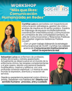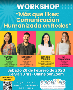 La Sociedad Chilena Interdisciplinaria de Humanización Sociosanitaria (SOCHIIHS), a través de su Dirección Ejecutiva de Comunicaciones, invita al workshop “Más que likes: Comunicación Humanizada en Redes”, un espacio formativo orientado a fortalecer la comunicación en salud desde una perspectiva ética, estratégica y centrada en las personas.