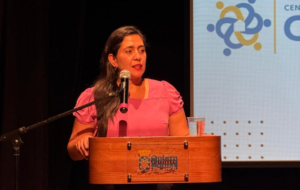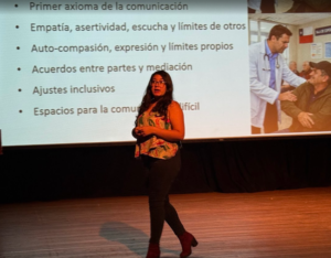 Stephanie Grimalt, presidenta de SOCHIIHS, quien presentó sobre comunicación efectiva como herramienta clave para la humanización de la atención.